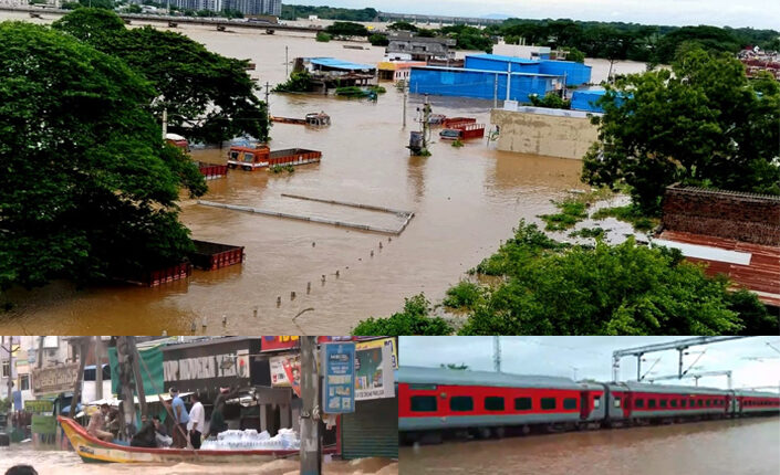 কার্যত জলের তলায় অন্ধ্রপ্রদেশ ও তেলেঙ্গানার বিস্তীর্ণ এলাকা। ব্যাহত রেল পরিষেবা। একপ্রকার যোগাযোগ বিচ্ছিন্ন পরিস্থিতি।