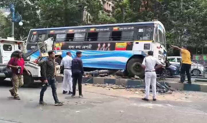পার্ক স্ট্রিট ময়দান থানা এলাকার প্রণবানন্দ সরণী এবং অকল্যান্ড রোডের সংযোগস্থলে বাসটি নিয়ন্ত্রণ হারায়। প্রাথমিকভাবে জানা গিয়েছে, দুটি বাসের মধ্যে রেষারেষি চলছিল। সেসময় নিয়ন্ত্রণ হারিয়ে ওই সরকারি বাসটি রাস্তার ডিভাইডারে ধাক্কা মারে। রেলিং ভেঙে সেটি ডিভাইডারের উপর উঠে যায়। বাসের সামনের দিকটি ক্ষতিগ্রস্ত হয়েছে।