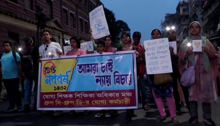 কলকাতা, ১৫ এপ্রিল: ২০১৬ সালে এসএসসির প্যানেলের গ্রুপ সি গ্রুপ ডির চাকরিহারাদের নববর্ষের প্রথম দিনে মোবাইলের ফ্ল্যাশলাইট জ্বেলে অভিনব মিছিল। ওয়েলিংটনের মোড় থেকে ধর্মতলার ওয়াই চ্যানেল পর্যন্ত এই মিছিল করেন তারা।