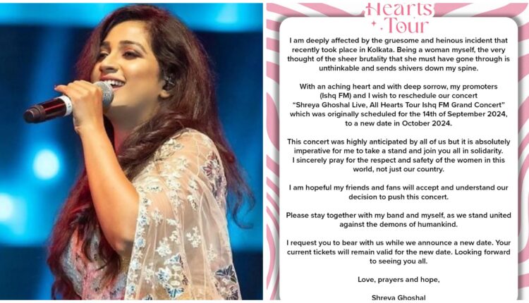 ১৪ সেপ্টেম্বর নেতাজি ইন্ডেরে শ্রেয়া ঘোষালের অনুষ্ঠান হওয়ার কথা ছিল। অপাতত সেই অনুষ্ঠান পিছিয়ে দেওয়া হয়েছে। অক্টোবরে কনসার্টটি হবে বলে জানিয়েছেন শ্রেয়া। সামজিক মাধ্যমে বিবৃতিতে শ্রেয়া লিখেছেন আরজি করের মহিলা চিকিৎসকের ধর্ষণ ও খুনে তিনি শিউরে উঠেছেন। এই পরিস্থিতিতে গানের অনুষ্ঠান করার অবস্থায় তিনি নেই। আরজি করের ঘটনার প্রতিবাদ কর্মসূচিকে সমর্থন জানিয়েছেন তিনি। পাশাপাশি কনসার্ট পিছিয়ে দেওয়ার জন্য ভক্তদের কাছেও ক্ষমা চেয়ে নিয়েছেন শ্রেয়া।